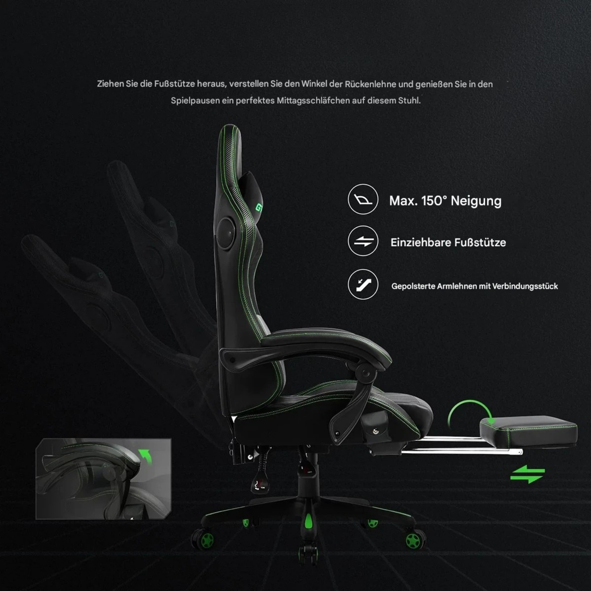 | Bezug | pflegeleichtes PU-Leder; Farbakzente dezent (z. B. Naht in Grün) |